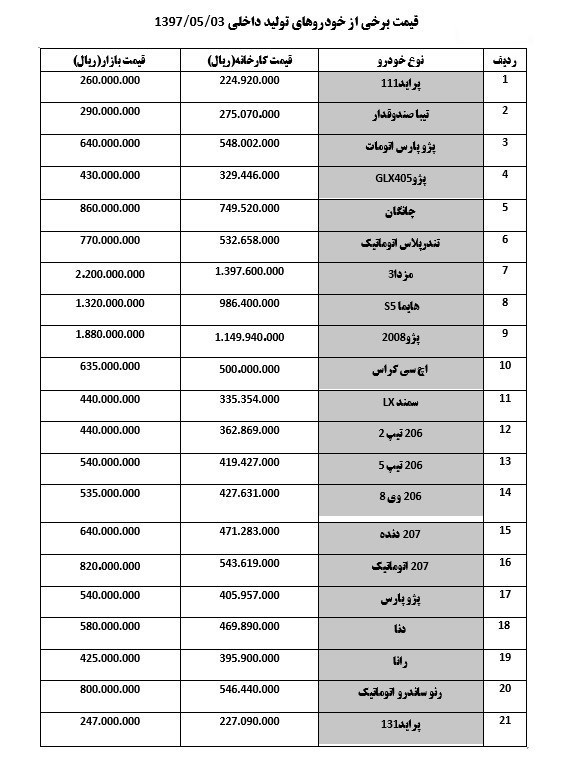 همچنین ساندرو اتوماتیک با افزایش 2 میلیون و 500 هزار تومان باقیمت 80 میلیون تومان، استپ وی با افزایش 2 میلیون تومانی با قیمت 90 میلیون تومان، پژو405 جی ال ایکس با افزایش 2 میلیون تومانی با قیمت 43 میلیون تومان و پژو206 تیپ 2 با افزایش 1 میلیون تومان با قیمت 44 میلیون تومان مورد معامله قرار می‌گیرد.
