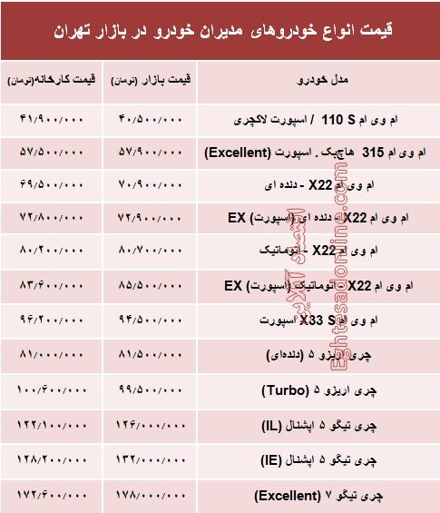 قیمت انواع خودروهای مدیران خودرو در بازار +جدول