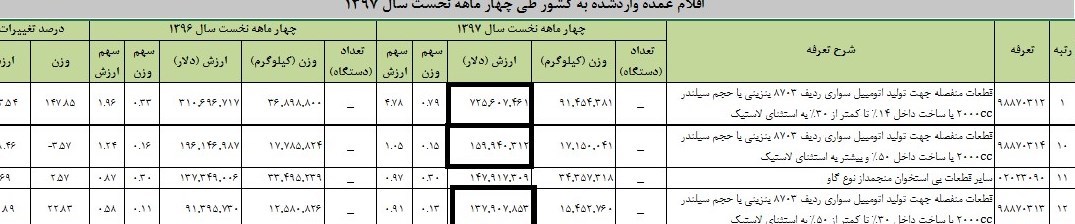 بر این اساس 725 میلیون دلار قطعات منفصله خودرو با ساخت داخل کمتر از 30 درصد، 160 میلیون دلار قطعات با ساخت داخل 50 درصد و بیشتر و 138 میلیون دلار قطعات با ساخت داخل 30 تا 50 درصد وارد کشور شده است.