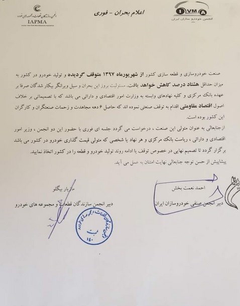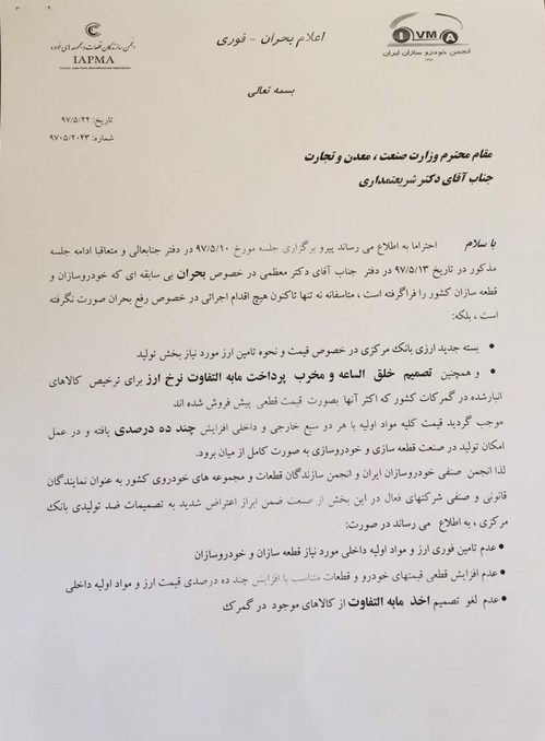 متن نامه نگاری قطعه سازان با دستگاه های مختلف برای رفع مشکلات این صنعت به شرح زیر است: