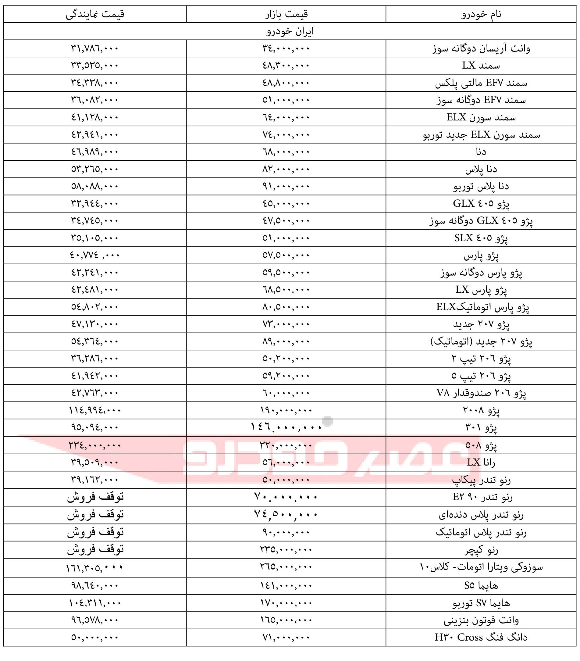 قیمت محصولات ایران خودرو و سایپا در بازار و نمایندگی اعلام شد.