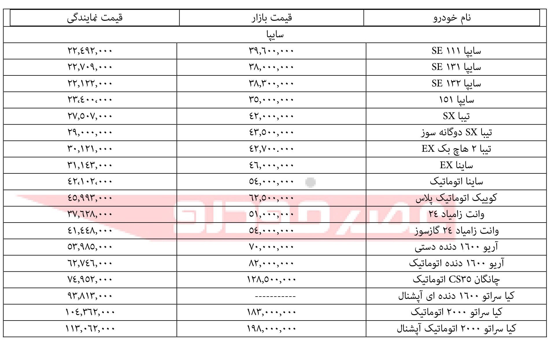 قیمت انواع محصولات سایپا ۵ شهریور ۹۷