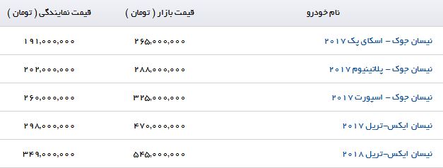قیمت محصولات نیسان در بازار و نمایندگی به شرح زیر است: