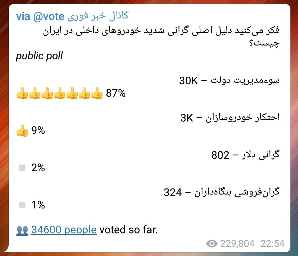 در این نظرسنجی از مخاطبان پرسیده شده بود، «فکر می کنید دلیل اصلی گرانی شدید خودروهای داخلی در ایران چیست؟» در پاسخ به این سوال چهار گزینه پیش روی مخاطبان قرار داشت که عبارت بودند از «سوءمدیریت دولت»، «احتکار خودروسازان»، «گرانی دلار» و «گران فروشی بنگاه داران».