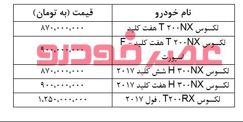 NX 200 از جمله خودروهای لوکس این برند به شمار می رود که نمونه صفر این خودرو با قیمت 870 میلیون تومان در بازار موجود است. لکسوس RX200 نیز با 1 میلیارد و 250 میلیون تومان به عنوان گرانترین لکسوس در بازار ایران موجود است: