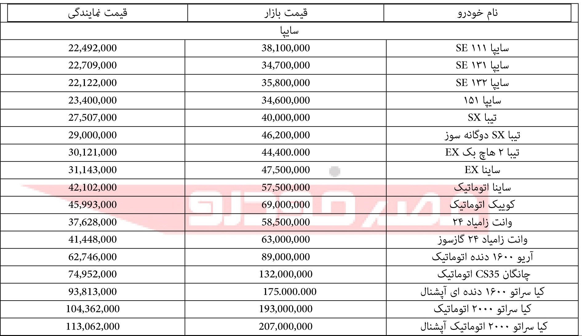 قیمت انواع محصولات سایپا ۱۰ آذر۹۷