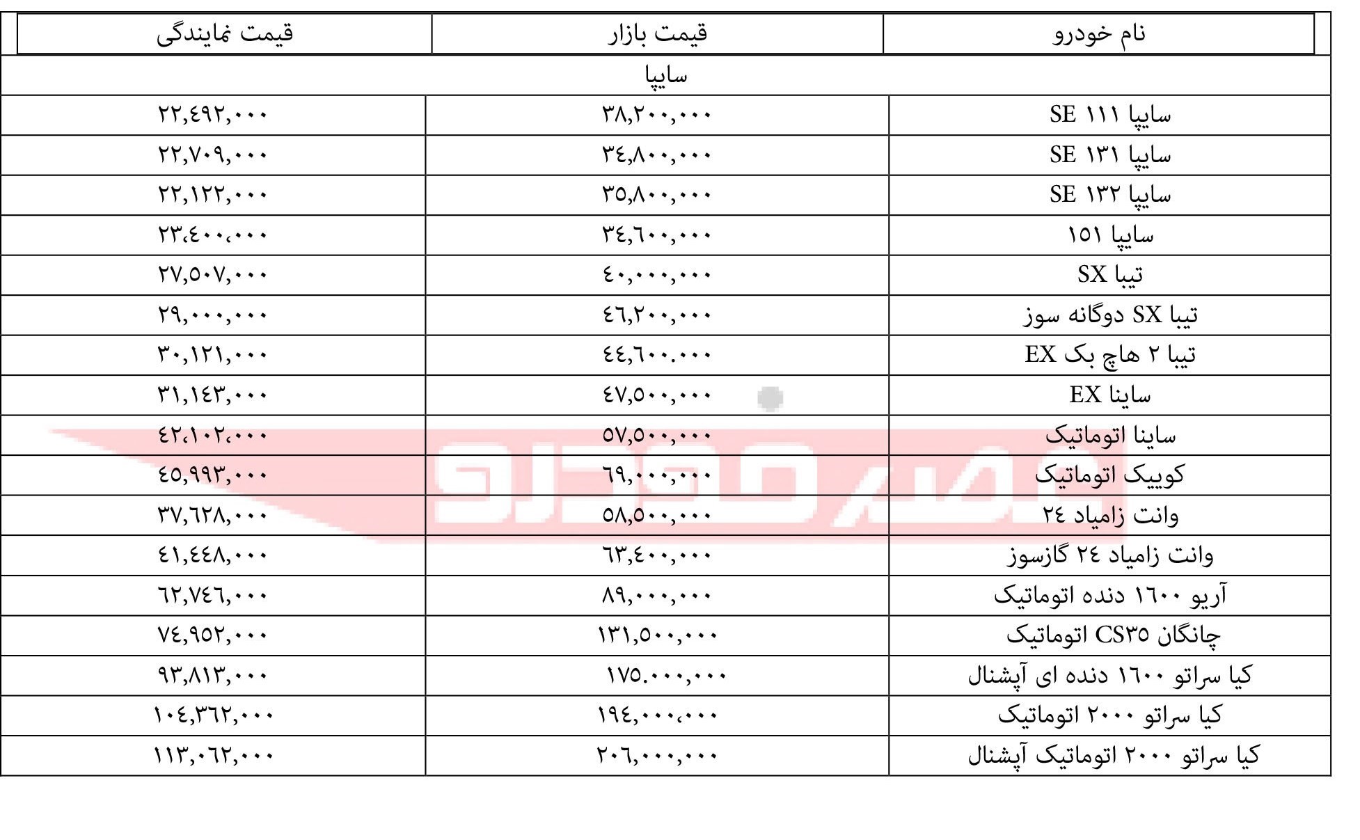 قیمت انواع محصولات سایپا ۱۳ آذر۹۷