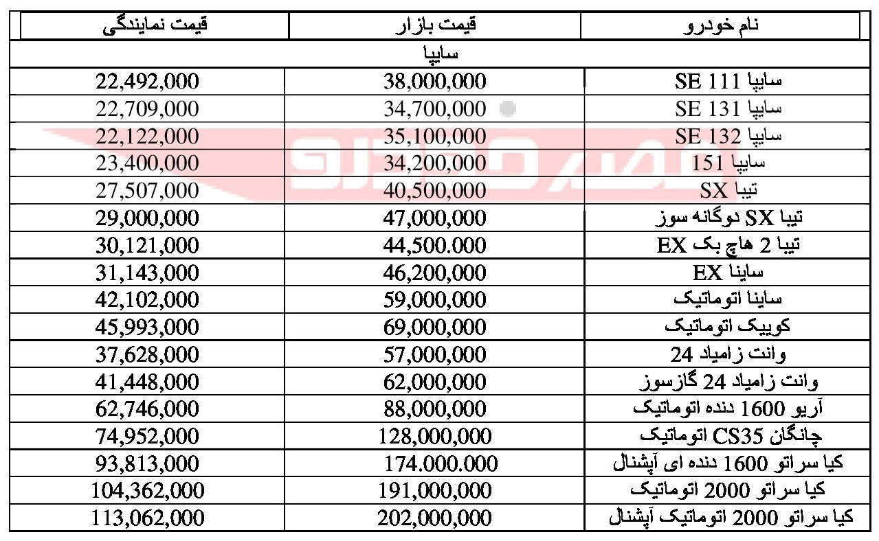 قیمت انواع محصولات سایپا ۲۴ آذر۹۷