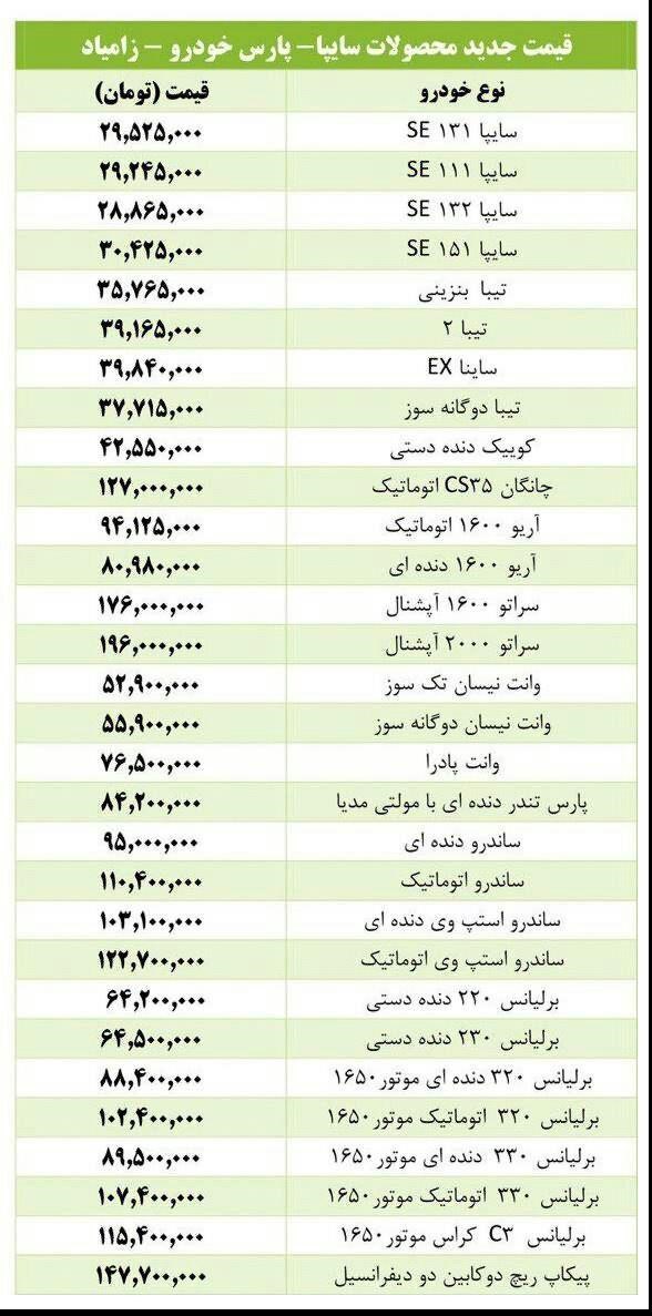 گروه خودروسازی سایپا فهرست قیمت های جدید محصولات خود را منتشر کرد.