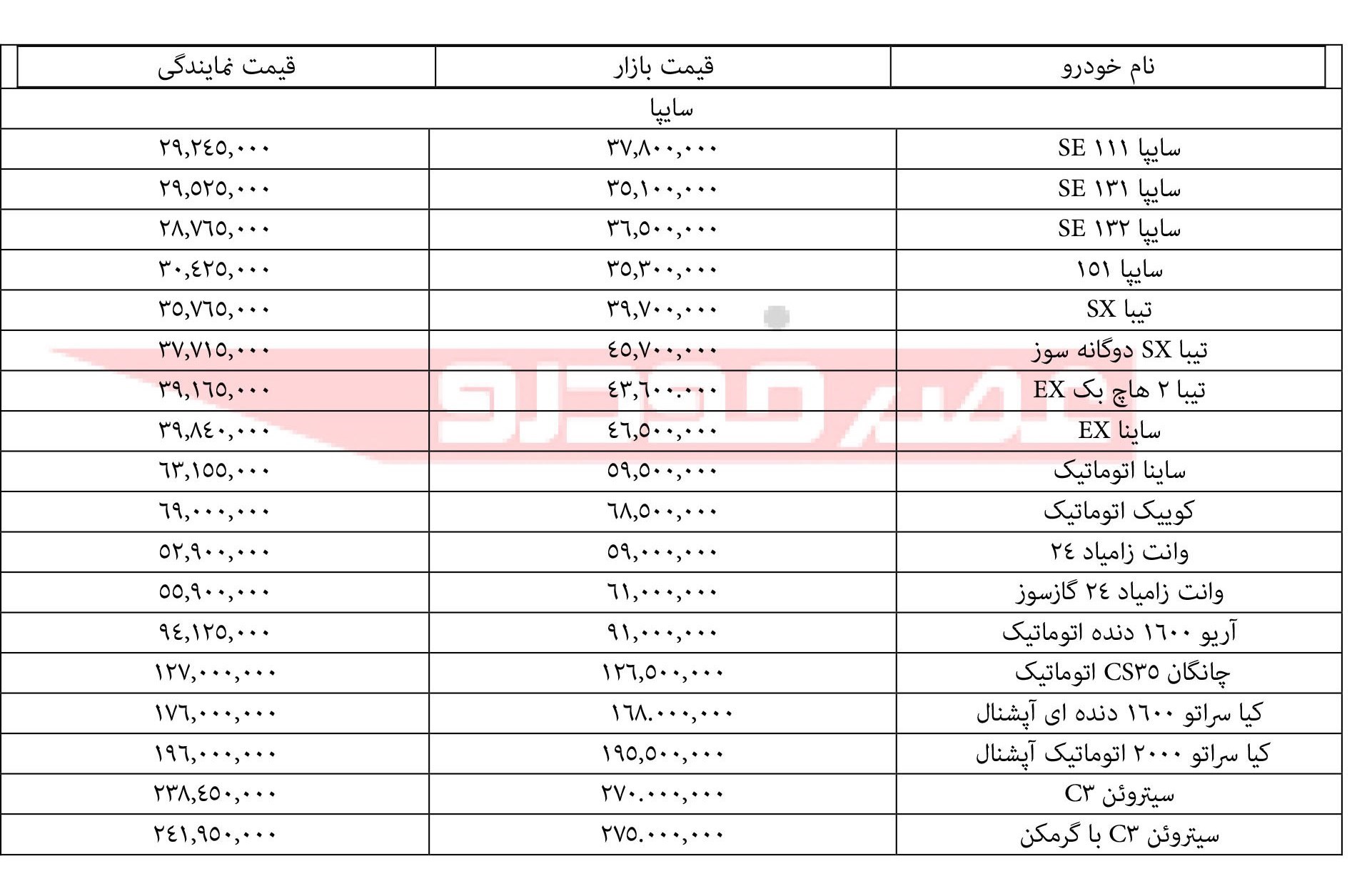 قیمت انواع محصولات سایپا در بازار و نمایندگی به شرح زیر است: