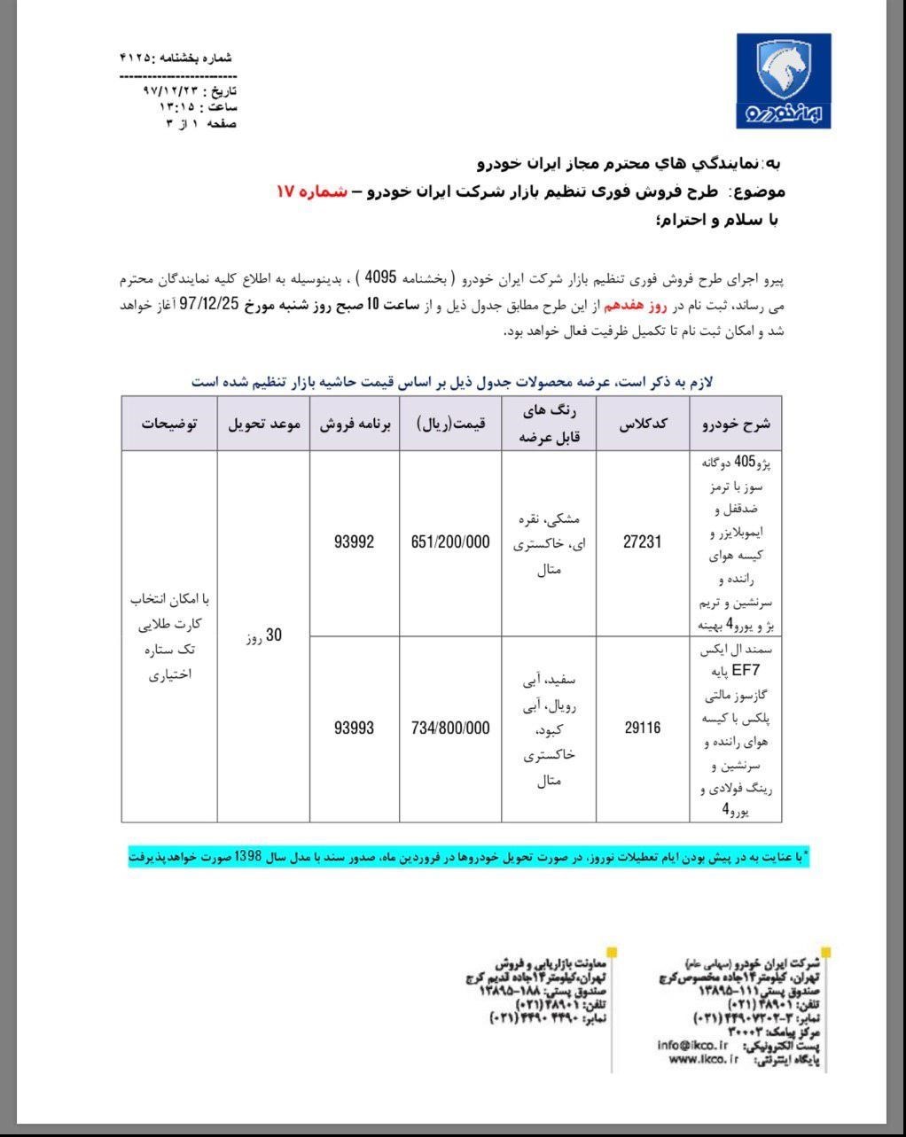 هفدهمین روز طرح فروش فوری تنظیم بازار ایران خودرو شنبه ۲۵ اسفند با فروش ۲ خودرو پژو ۴۰۵ و سمند ال ایکس ادامه می یابد.