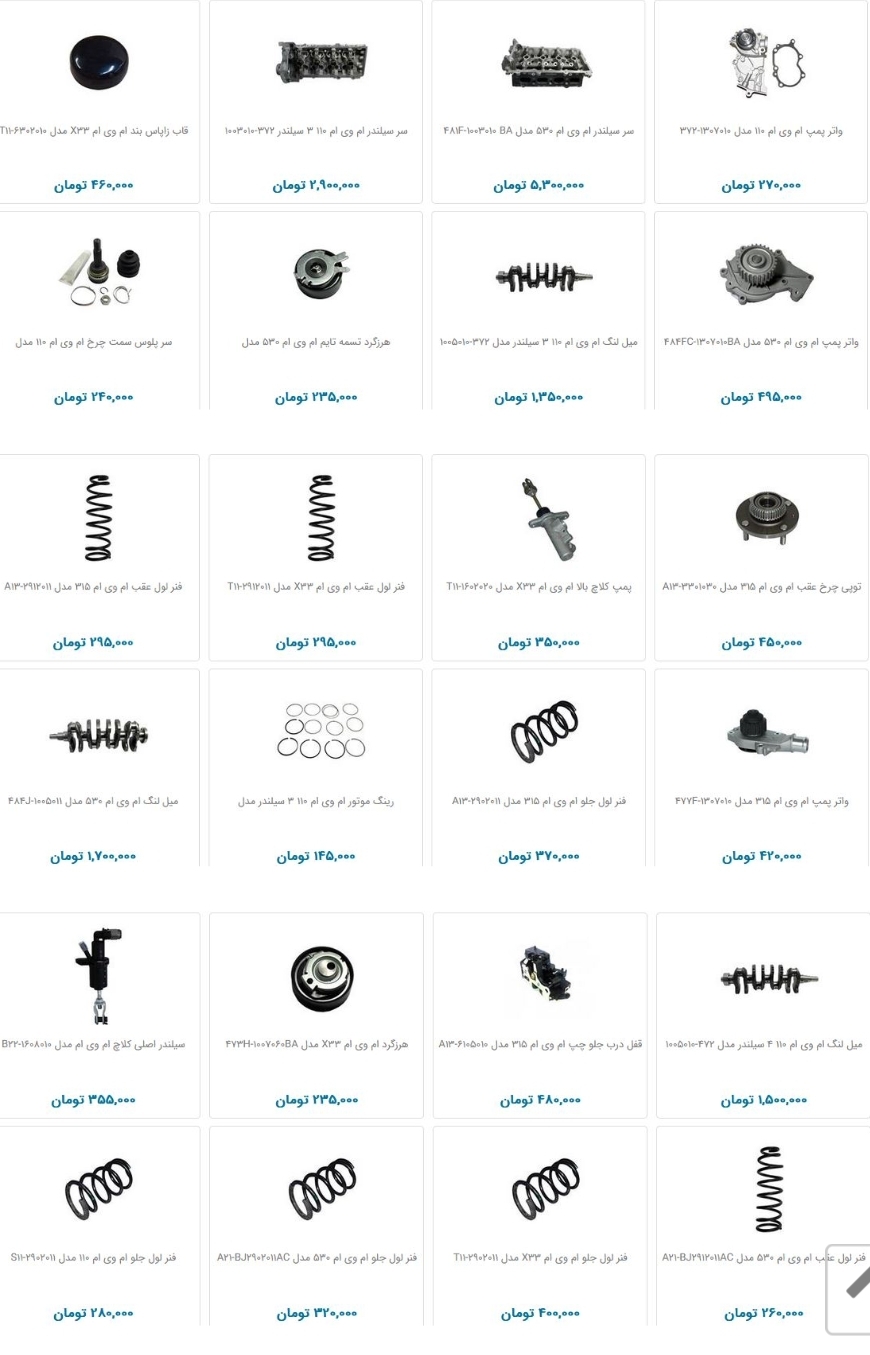 قیمت لوازم یدکی خودرو ام وی ام به صورت تقریبی در جدول زیر آمده است: