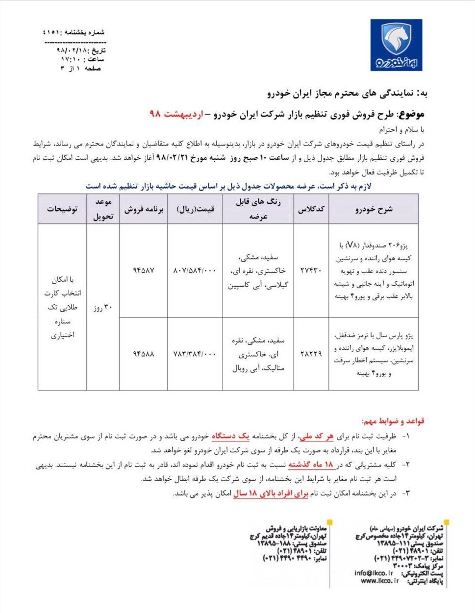 طرح فروش جدید تنظیم بازار ایران خودرو امروز ٢١ ام اردیبهشت ساعت١0 صبح از طریق وب سایت ایران خودرو آغاز میشود.