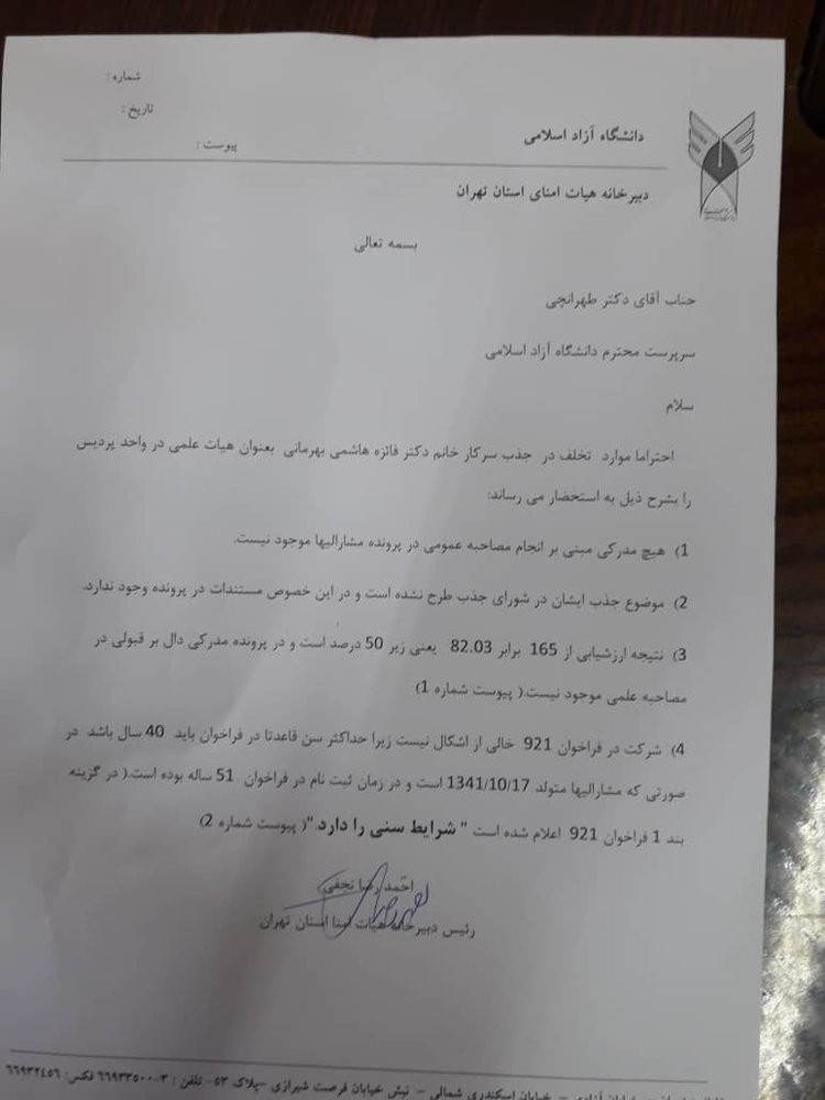 در این نامه آمده است: «احتراما موارد تخلف در جذب فائزه هاشمی بهرمانی به عنوان هیات علمی در واحد پردیس را به شرح ذیل به استحضار می رساند: