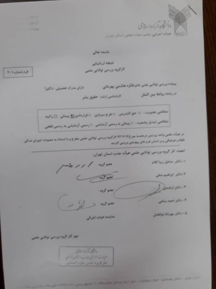 سوم اینکه نتیجه ارزشیابی فائزه هاشمی بهرمانی از ۱۶۵ برابر ۸۲/۰۳ یعنی زیر ۵۰ درصد است و در پرونده وی مدرکی دال بر قبولی در مصاحبه علمی موجود نیست. این ارزشیابی مشتمل بر شاخص هایی نظیر چاپ مقالات در مجله های معتبر علمی، چاپ و تالیف کتاب، شرکت در پروژه های پژوهشی و ... است که متاسفانه فائزه هاشمی نتوانسته نمره لازم را کسب کرده ولی با این حال در یک تخلف آشکار علمی و قانونی در زمان تصدی پدر مرحومش در دانشگاه آزاد اسلامی واحد پردیس جذب شده است.