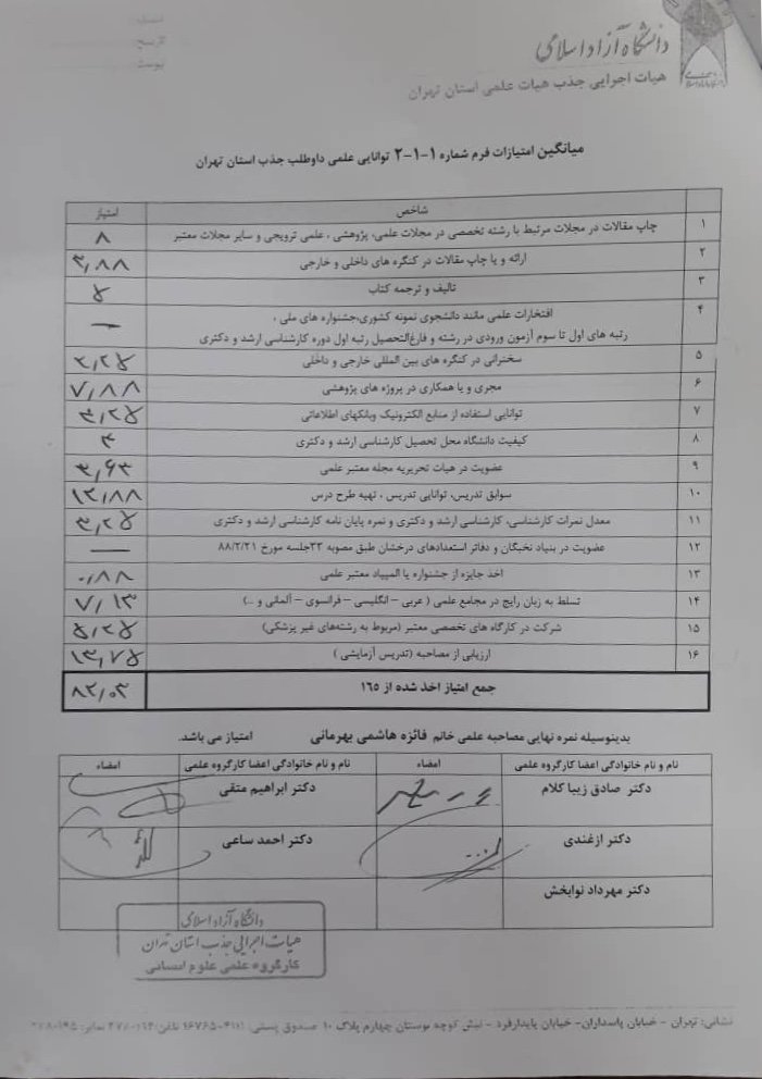 ۳- نتیجه ارزشیابی از ۱۶۵ برابر ۸۲:۰۳ یعنی زیر ۵۰ درصد است و در پرونده مدرکی دال بر قبولی در مصاحبه علمی موجود نیست.