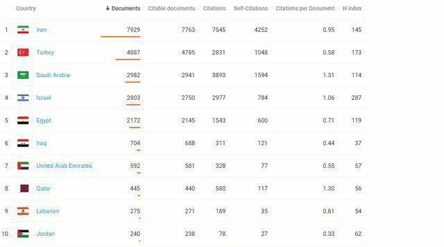 رژیم صهیونیستی، مصر، عراق، امارات، قطر، لبنان و اردن جایگاههای بعدی تا رتبه ۱۰ را از آن خود کردهاند.