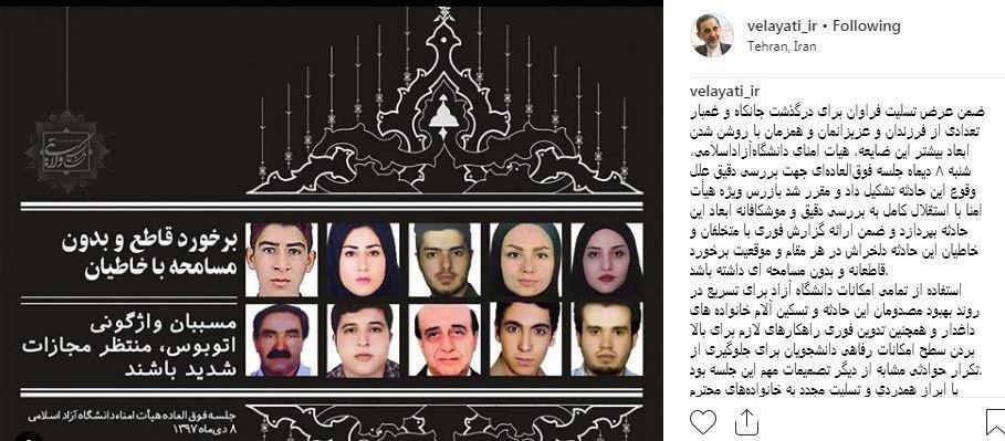 علیاکبر ولایتی رئیس هیات امنا و هیات موسس دانشگاه آزاد در پیج اینستاگرام خود اعلام کرد: ضمن عرض تسلیت برای درگذشت تعدادی از دانشجویان دانشگاه آزاد جلسه هیات ا منای این دانشگاه برای روشن شدن ابعاد این حادثه و بررسی دقیق علل وقوع آن برگزار شد.