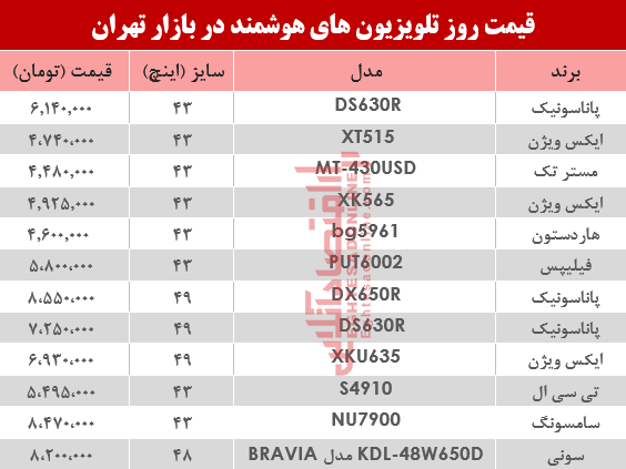 آنچه در زیر میآید جدول قیمت روز پرفروشترین انواع تلویزیون هوشمند در سطح بازار تهران است.