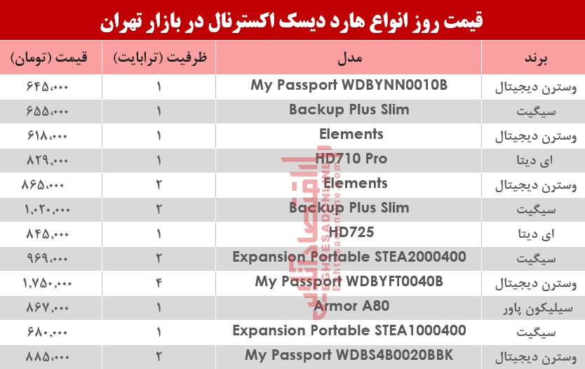 آنچه در زیر می آید جدول قیمت انواع هارد دیسک اکسترنال در سطح بازار تهران است.