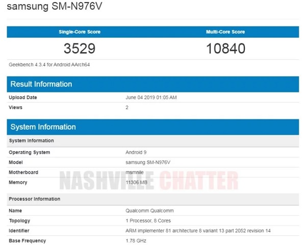 اما همزمان با این بنچمارک، بنچمارک دیگری نیز برای گوشی به شماره مدل SM-N976B منتشر شده که نسخه دیگری از آن خواهد بود و در بخش پردازشی متفاوت از نسخه قبلیست. در این بنچمارک، میزان حافظه گوشی 8 گیگابایت و پردازنده داخلی آن نیز Exynos 9825 است که در بستر سیستم عامل اندروید 9.0 توانسته به امتیازی برابر با 3557 در حالت تک هستهای و 9654 در حالت چند هستهای برسد که کمی بالاتر از نسخه Snapdragon است.