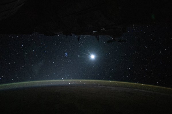 فضانورد ایستگاه فضایی بینالمللی یک عکس تهیه کرده که زمین، ماه و ستارهها در آن دیده میشوند.
