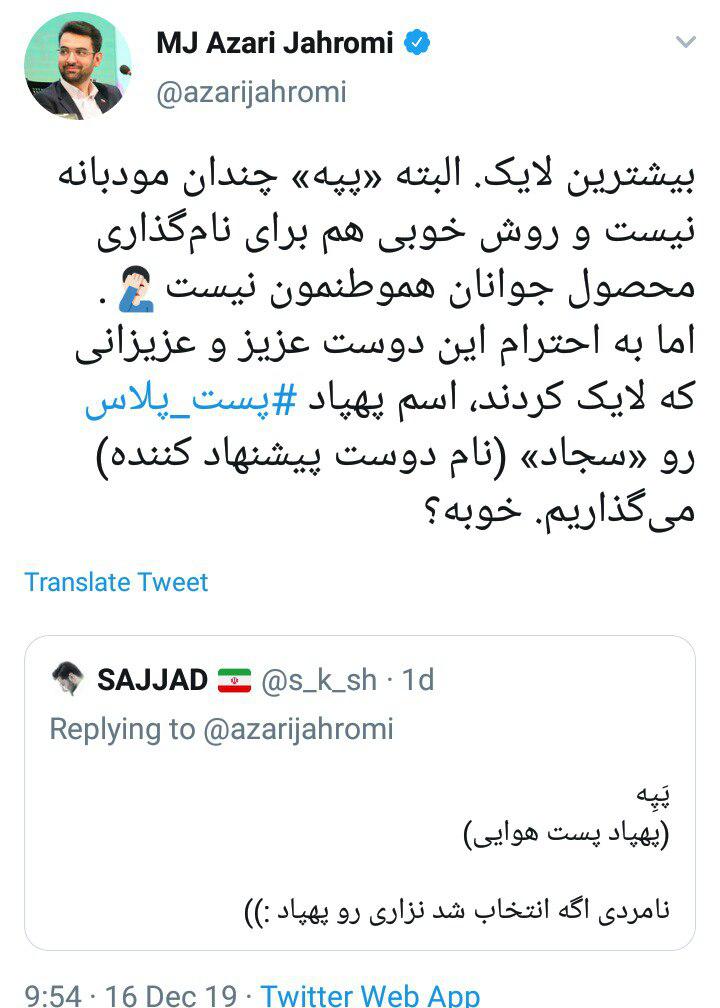 آذری جهرمی وزیر ارتباطات با انتشار توئیتی از نامگذاری پهپاد پست پلاس به نام «سجاد» خبر داد.