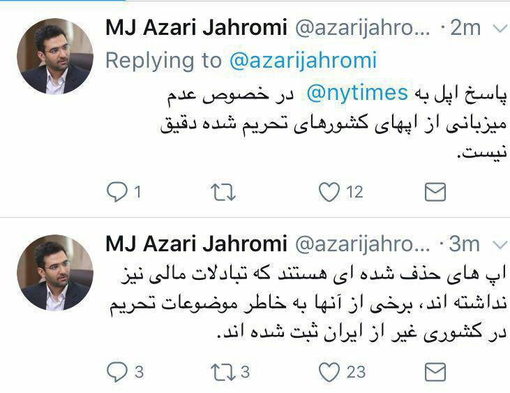 به گزارش خبر فوری ، محمد جواد آذری جهرمی به حذف اپلیکیشن های فارسی از اپ استور واکنش نشان داد. 33