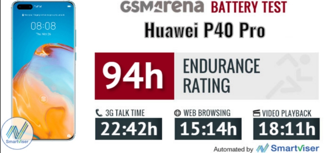 اما شاید جذابترین و به نوعی مهمترین ویژگی یک باتری، دوام آن است. براساس تست صورت گرفته توسط GSMarena باتری P40 Pro به مدت ۹۴ ساعت دوام میآورد که بالاتر از رقبایی با باتریهایی ۴۵۰۰ یا ۵۰۰۰ میلیآمپر ساعتی است.