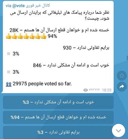 به گزارش خبر فوری ، در این نظرسنجی که 29 هزار و 975 نفر در آن شرکت کردهاند، از مخاطبان درباره ارسال پیامکهای تبلیغاتی سوال شده که از این تعداد شرکت کننده، 28هزار نفر معادل 94درصد، تاکید کردهاند از ارسال این حجم از تبلیغات پیامکی خسته شده و خواهان قطع این پیامکها هستند.