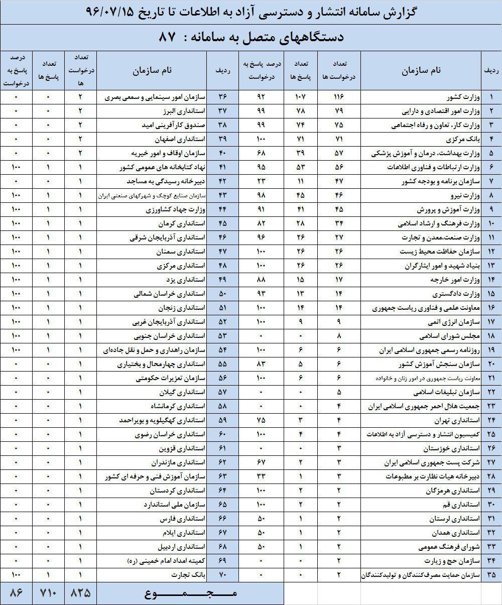 در لیست ارائه شده برخی از دستگاهها و نهادهای اجرایی کشورمان در قوهقضائیه، بانکها و وزارتخانهها درباره عملکرد خود در حیطه عمل به دسترسی آزاد به اطلاعات اقدامی انجام نداده و نامی از آنها در لیست ارائه شده وجود ندارد از این رو بدون شک وزارت ارتباطات و فرهنگ به عنوان متولیان این سامانه باید در جهت پاسخگویی به این موضع وارد عمل شده و دستگاههایی را که به وظایف خود عمل نکردند معرفی کنند.