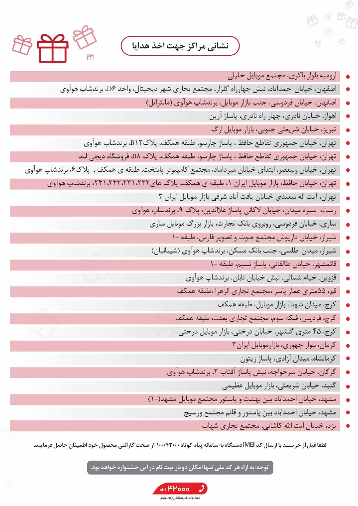 این جوایز به تمامی گوشیهای دارای گارانتی معتبر و اصلی تعلق میگیرد و خریداران محترم میتوانند از طریق تمامی فروشگاههای معتبر سراسر کشور به خصوص فروشگاههای منتخب هوآوی خرید خود را انجام دهند. اما برای دریافت هدایه خود باید به مراکز اعلام شده از طرف هوآوی مراجعه کنند که در ادامه لیست کامل آن آماده است.