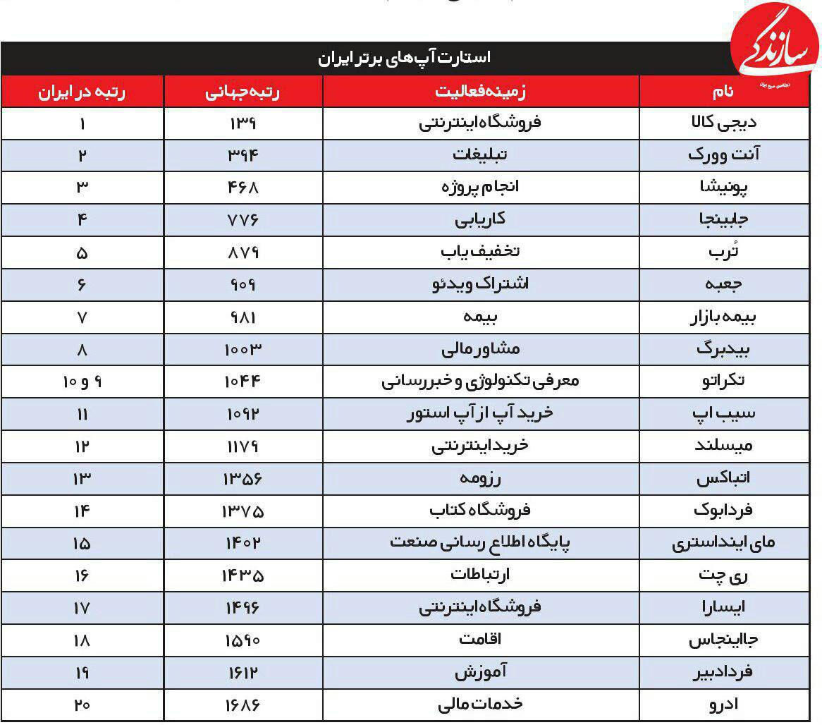 برترین استارت آپ های ایران در این جدول مشخص شده اند.