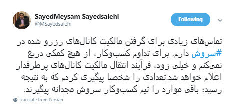 سیدصالحی در توئیتر خود نوشت: " تماس‌های زیادی برای گرفتن مالکیت کانال‌های رزرو شده در سروش دارم. برای تداوم کسب‌وکار، از هیچ کمکی دریغ نمی‌کنم و خیلی زود، فرآیند انتقال مالکیت کانال‌های پرطرفدار اعلام خواهد شد. تعدادی را شخصا پیگیری کردم که به نتیجه رسید؛ باقی موارد را تیم کسب‌وکار سروش مجدانه پیگیرند. "/باشگاه خبرنگاران