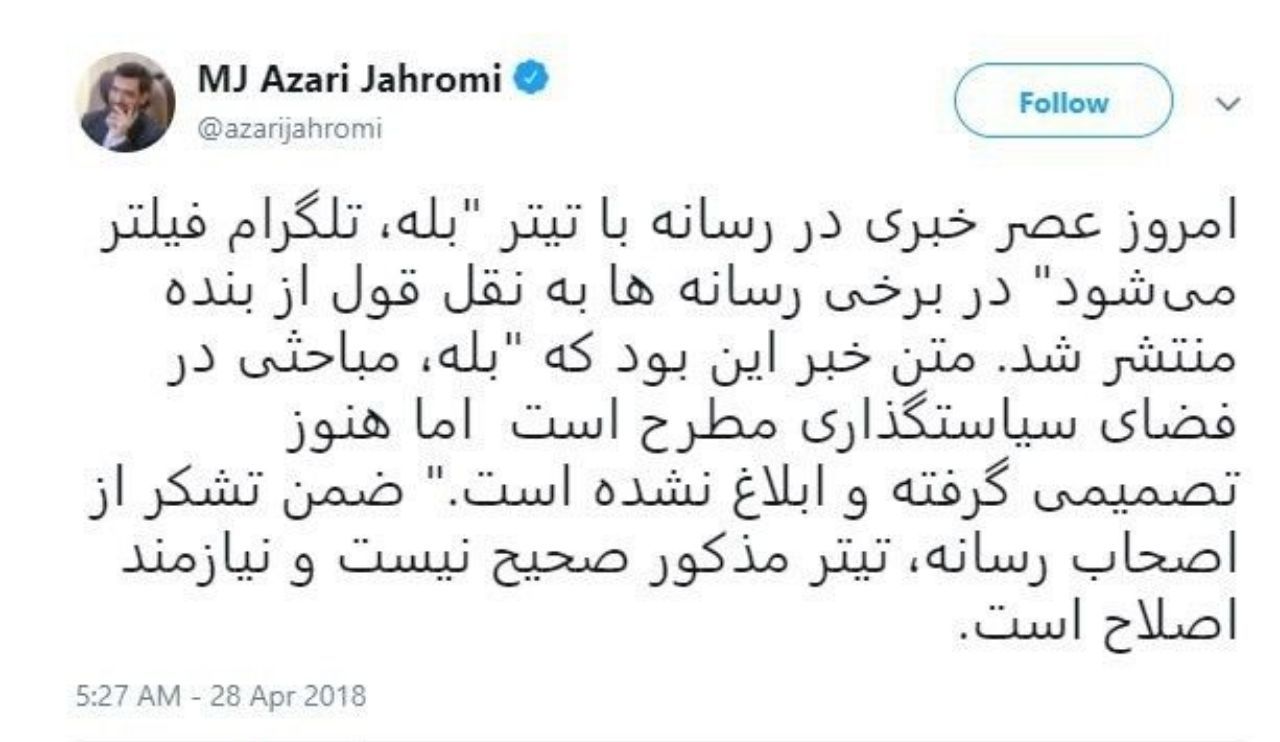 گفتنی است؛ پس از انتشار این خبر، برخی رسانه ها تیتر «بله، تلگرام فیلتر میشود» را برای این گفتگو برگزیدند که وزیر ارتباطات با انتشار توئیتی، این تیتر را دقیق ندانست.
