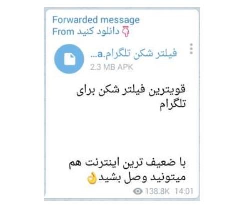 برنامه «فیلترشکن تلگرام» از جمله برنامههای آمادهای است که با توجه به کد آن، در مقاطع مختلف زمانی با عناوین مختلفی و برای سوءاستفادههای مختلف منتشر میشود. این برنامه توسط ۱۲ ضدویروس به عنوان بدافزار تشخیص داده شده و در تبلیغات گسترده در سطح تلگرام منتشر شده که نمونهای از آن در شکل زیر، با ۱۳۸ هزار بازدید قابل مشاهده است.