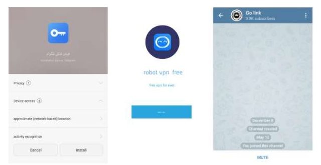 پس از نصب برنامه، ابتدا صفحه نشان دادهشده در شکل زیر به قربانی نشان داده میشود. پس از زدن دکمه شروع کانال golinkbot در تلگرام باز میشود. پس از آن آیکون برنامه حذف میشود و برنامه در پسزمینه فعالیت خود را ادامه میدهد.