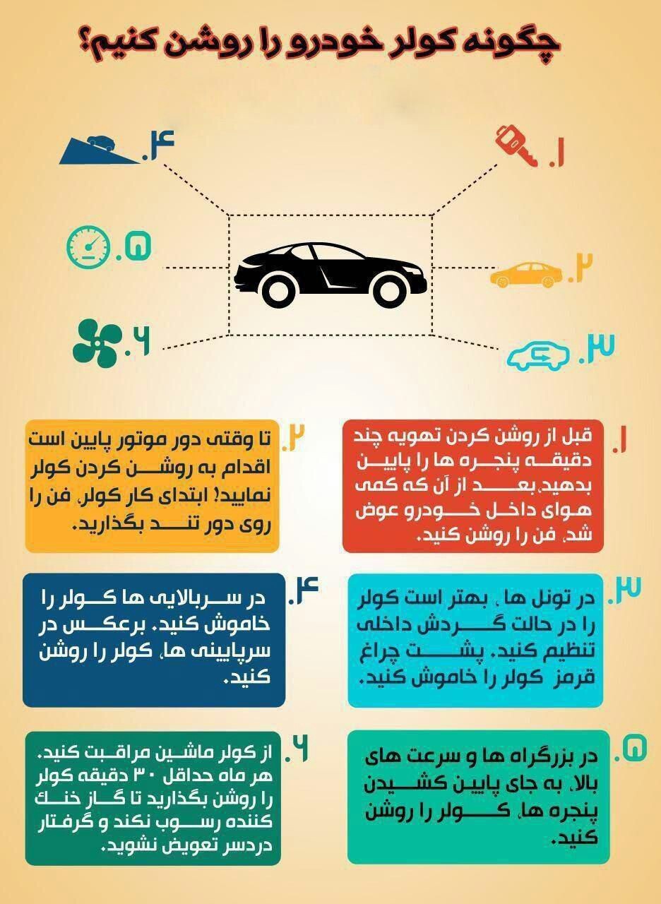 گرمای هوا باعث شده مدت زمان استفاده از کولر خودرو در میان رانندگان وسایل نقلیه افزایش یابد. با دانستن چند نکته اساسی می توانید عمر مفید کولر خودرو خود را افزایش دهید. به همین منظور در ادامه نکاتی در رابطه با استفاده درست از کولر خودرو در قالب اینفوگرافیک ارائه شده است.