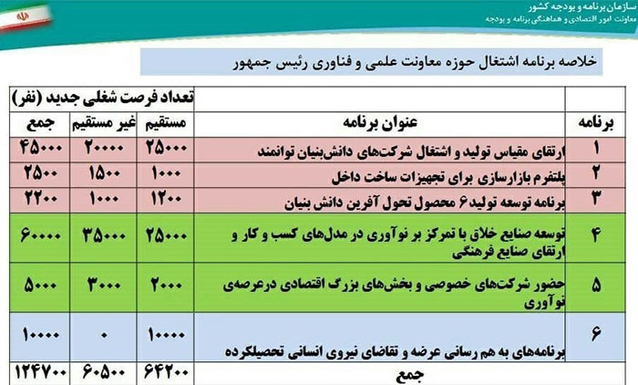 لازم به ذکر است که سازمان برنامه و بودجهی کشور و معاونت علمی و فناوری، پیش از این ۱۲ برنامه و ۲ برنامهی مکمل را برای اشتغالزایی تصویب کردهاند که در مجموع به ایجاد ۳۹۸ هزار شغل خواهد انجامید. برنامههای اشارهشده در این خبر، اشتغالزایی در حوزه شرکتهای داشبنیان و صنایع خلاق را هدف قرار دادهاند که بهصورت مستقیم، بیش از ۶۴ هزار شغل ایجاد خواهد کرد.
