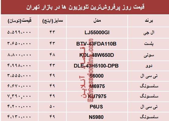 آنچه در زیر می آید جدول قیمت انواع پرفروش ترین تلویزیون در سطح بازار تهران است؛شایان ذکر است که این نرخ‌ها ممکن است بر اساس برخی امکانات جانبی و خدمات پس از فروش در مناطق مختلف شهر تا ۱۰ درصد تفاوت قیمت داشته باشد.