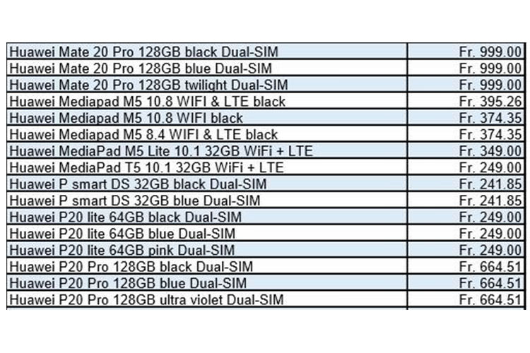 بههمین دلیل، معمولا در نهایت مصرفکنندگان میتوانند محصول را با قیمتی بین ۵۰ تا ۱۰۰ دلار بیشتر از بازار تهیه کنند. یکی از نکات جالبی که در مورد جدول قیمتها وجود دارد این است که قیمتها برحسب فرانک سوئیس برای PhoneArena ارسال شدهاند. قیمت پایهی Huawei Mate 20، از ۸۰۵ دلار برابر با 799 فرانک سوئیس آغاز میشود. این بدین معنی است که مصرفکنندگان باید انتظار داشته باشند تا این نسخهی میت ۲۰ را با قیمتی در حدود ۸۵۰ تا ۹۰۰ دلار از بازار خریداری کنند. با نگاهی به جدول قیمتها متوجه میشوید که برچسب قیمت مربوط به میت ۲۰ هواوی با ظرفیت حافظهی داخلی ۱۲۸ گیگابایت است. متاسفانه، ظرفیت حافظهی رم این گوشی هوشمند مشخص نشده است. البته با توجه به نسخههای قبلی گوشیهای هوشمندHuawei، احتمال آن میرود که این مدل، ظرفیت حافظهی رم ۴ گیگابایتی داشته باشد. در هر صورت، انتظار میرود هواوی میت ۲۰ در رنگهای مشکی، آبی و شفقی به بازار عرضه شود.
