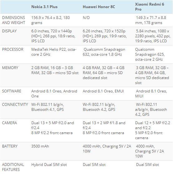 نوکیا 3.1 پلاس در آیندهای نزدیک و با برچسب قیمتی 154 دلار/133 یورو در هند عرضه خواهد شد. آنر 8C با قیمت 158 دلار/136 یورو در چین به فروش میرسد و شیائومی ردمی 6 پرو نیز اکنون با قیمت حدودا 150 دلار/130 یورو در بازار جهانی قابلدسترس است. از نظر برخی کارشناسان، در این مقایسه آنر 8C جالبترین دستگاه محسوب میشود. اما میان این هندستها تفاوتهای بسیار اندکی وجود دارد؛ بنابراین تعیین برنده واقعی امکانپذیر نخواهد بود.
