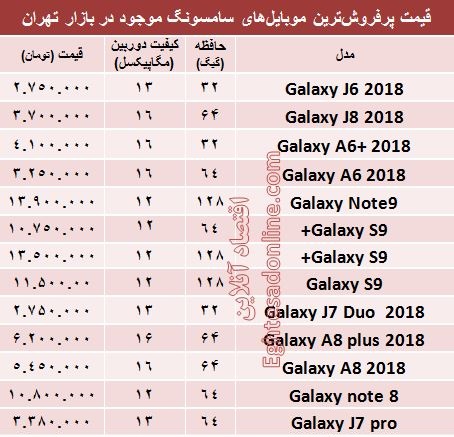 آنچه در زیر می بینید آخرین قیمت انواع موبایلهای سامسونگ موجود در سطح بازار تهران است. نکته قابل توجه عدم تغییر قیمت ها با وجود کاهش نسبی نرخ ارز می باشد.