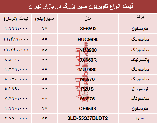 آنچه در زیر می آید جدول قیمت انواع تلویزیون سایز بزرگ در سطح بازار تهران است.