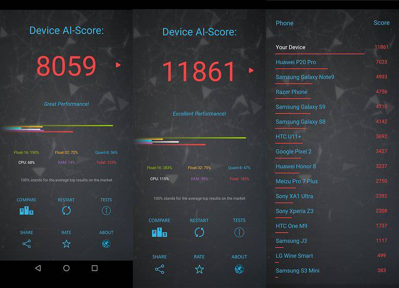 گوشی هواوی P20 پرو حاضر در این بنچمارک، اندروید 9 و رابط کاربری EMUI 9.0 را اجرا میکند. بهینهسازیهای نرمافزاری در نسخه جدید و البته بهبودهایی که هواوی در بخش پردازش عصبی و هوش مصنوعی آن اعمال کرده، باعث شده که امتیاز دیوایس در دسترس ما نزدیک به هزار واحد بیشتر از متوسط امتیاز تمام مدلهای این گوشی باشد. بخش نرمافزاری همواره نقش مهمی در عملکرد یک دستگاه داشته و همانگونه که میبینید، بهروزرسانی این گوشی موجب شده که امتیاز آن در این تستها به 8,059 برسد. این در حالی است که متوسط امتیاز این گوشی در تست فوق برابر با 7,023 است. گوشی هواوی میت 20 پرو نیز امتیاز 11,861 را در این بنچمارک کسب کرد.
