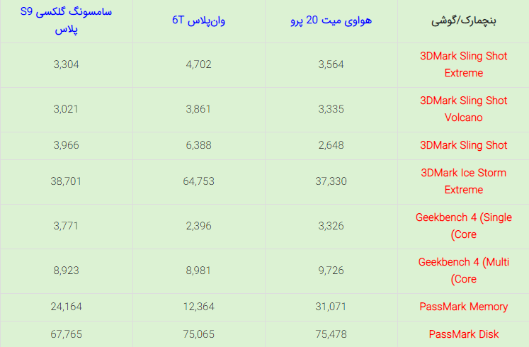 در وهله اول تصمیم گرفتیم که قدرت پردازشی و عملکرد این دیوایس را با بنچمارکهای معروف و آشنایی مانند گیکبنچ تست کنیم. اگرچه نتایج این تستها لزوما منعکسکننده تمام تواناییهای یک دستگاه در استفادههای روزمره نخواهد بود اما در باب قیاس، یک گزینه مناسب برای مقایسه قدرت و عملکرد دیوایسهای مختلف در ابعاد گوناگون خواهد بود. تست 3DMark عملکرد بخش گرافیکی را مورد ارزیابی قرار میدهد، تست گیکبنچ توانایی هستههای پردازشی را چه به صورت جداگانه و چه به صورت کلی بررسی میکند و نهایتا تست PassMark به ارزیابی عملکرد بخش حافظه میپردازد. در جدول یک (عکس دو گالری) میتوانید نتایج بنچمارکهای هواوی میت 20 پرو را در کنار بنچمارک گوشیهای وانپلاس 6T و گلکسی S9 پلاس ببینید.