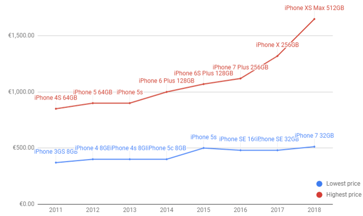 به تازگی نسخه جدید گوشی موبایل iPhone XS Max (همراه با 512گیگابایت حافظه) با قیمت 1650 یورو وارد بازار شده؛ قیمتی که در برخی بازارها حتی بیشتر اعلام شده و جنجال زیادی هم به پا کرده است، برخی میگویند بهتر است با این پول خودرو بخرید تا تلفن همراه!!! در طول این سالها، قیمت گوشیهای همراه اپل با روند تدریجی افزایش داشته و همواره گرانتر از قبل به بازار ارائه میشوند. به طوری که ما تصمیم گرفتیم آنها را وارد نمودار کنیم. به شیب خطوط نمودار یک (عکس 2 گالری) نگاهی بیاندازید.