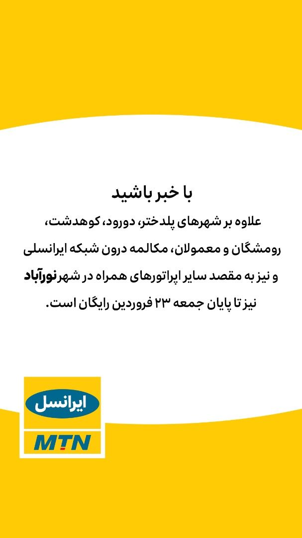 علاوه بر شهرهای پلدختر، دورود، کوهدشت، رومشگان و معمولان،مکالمه درون شبکه ایرانسلی و نیز به مقصد سایر اپراتورهای همراه در شهر نورآباد نیز تا پایان جمعه ۲۳ فروردین رایگان است.