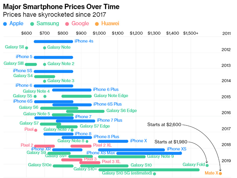 ما چگونه از آیفون و گلکسی اس ۵۰۰ دلاری به پرچمداران هزار دلاری شرکتهای اپل، سامسونگ و هواوی رسیدیم؟ برای این موضوع بهتر است که به نمودار ایجاد شده توسط خبرگزاری بلومبرگ نگاهی بیندازید و در آن بهراحتی میتوانید نقطه جهش را مشاهده کنید.