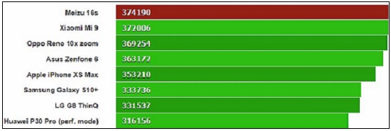 مدل میزو 16s در این بنچمارک توانسته از پس پرچمداران سامسونگ با پردازندههای اسنپدراگون ۸۵۵، هوآوی با پردازنده Kirin 980، دیگر محصولات سامسونگ با پردازنده Exynos 9820 و پردازنده پرچمداران اپل نیز بربیایید. عملکرد جدید میزو 16s این مدل را بالاتر از آیفون XS Max، شیائومی Mi 9، سامسونگ گلکسی S10 پلاس و هوآوی P30 Pro قرار میدهد، درواقع مدل جدید میزو توانسته تمامی مدلهای قدرتمند بازار را شکست دهد و به عنوان بهترین تلفنهوشمند موجود از نظر بنچمارک AnTuTu شناخته شود. در لیست زیر مدلهای برتر بازار به همراه امتیازاتشان را مشاهده میکنید.